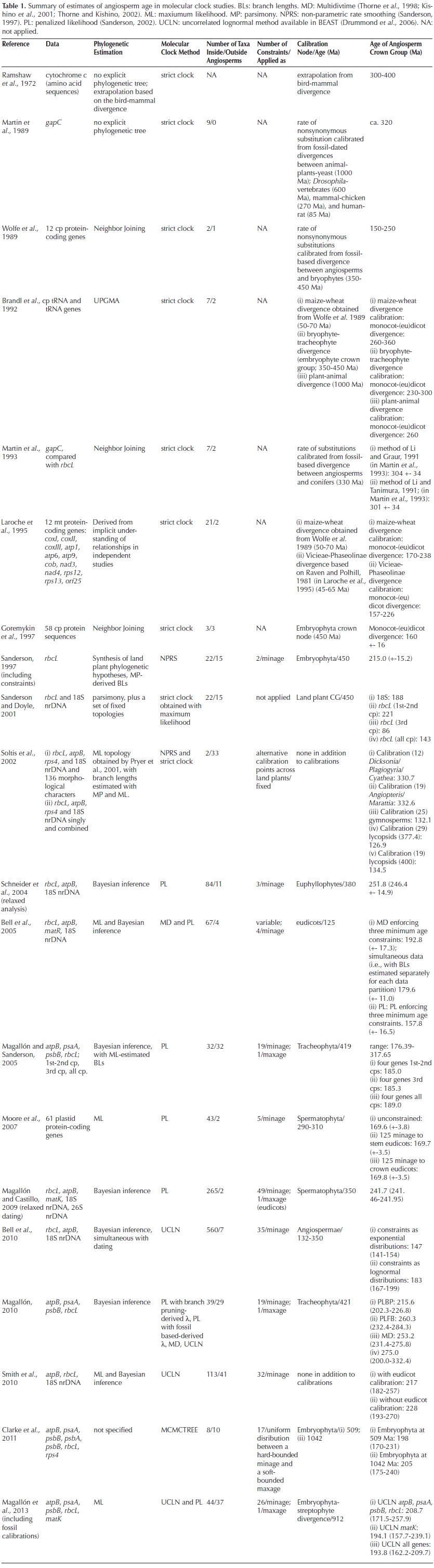 Several molecular estimates of angiosperm age are available, derived both from strict and relaxed clocks, and most provide ages that are substantially older than the oldest angiosperm fossils (Table 1). Some of the earliest strict clock studies (e.g., Ramshaw, 1972 Martin et al., 1989, 1993; Brandl et al., 1992) estimated ages of 300 Ma or older for angiosperms, or within angiosperms. Relaxed clock studies have also provided older-than-fossil estimates, for example, the most recent studies (Bell et al., 2010; Magallón, 2010; Smith et al., 2010; Clarke et al., 2011) estimate the crown age of angiosperms between 147 Ma (Bell et al., 2010) and 275 Ma (Magallón, 2010). These studies include differential taxonomic sampling and density, are based on different types of data and implement different calibrations and constraints, hence, it not possible to jointly examine the effect of individual parameters on angiosperm age estimates. However, some studies have evaluated the effect of calibration and constraints (Soltis et al., 2002; Moore et al., 2007; Bell et al., 2010; Smith et al., 2010; Clarke et al., 2011; Magallón et al., 2013) the use of different codon positions (Sanderson and Doyle, 2001; Magallón and Sanderson, 2005; Magallón et al., 2013); of different methods to estimate branch lengths (Soltis et al., 2002; Magallón, 2010), and of different relaxed clock method (Magallón, 2010; Magallón et al., 2013).