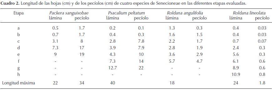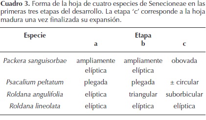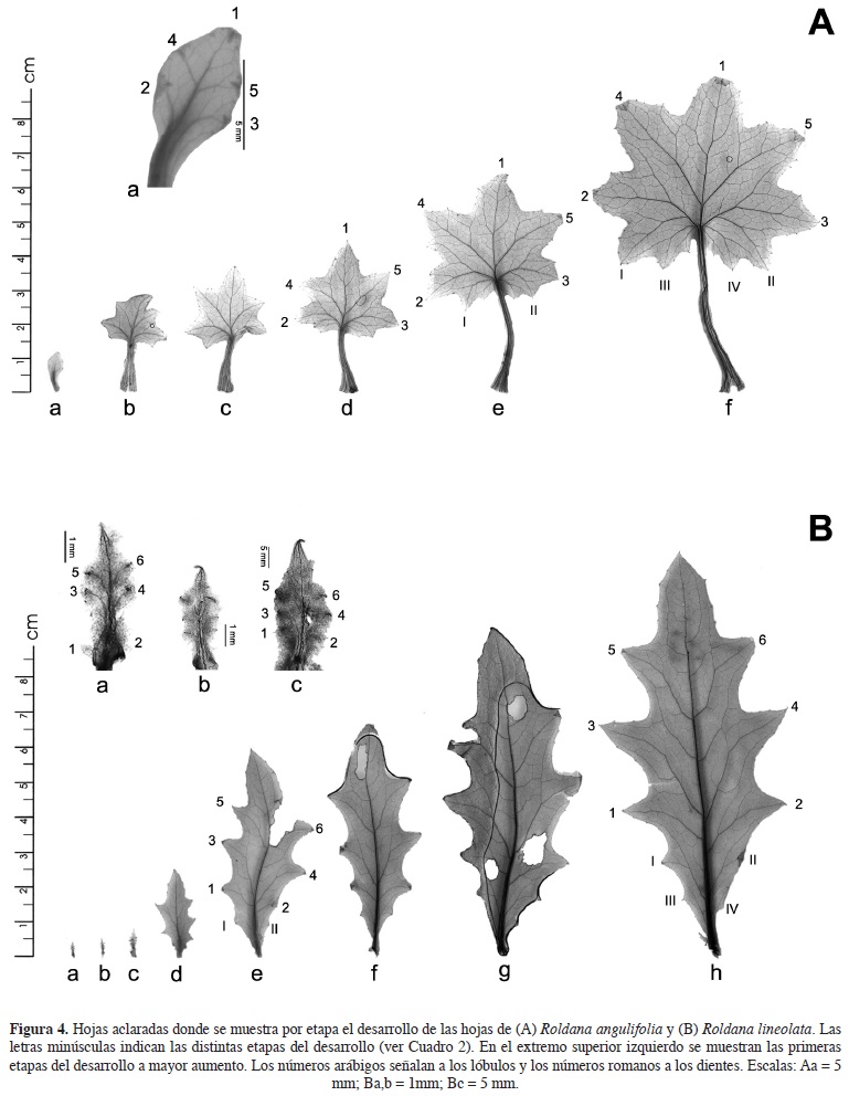 Como señalan Dengler y Kang (2001), la forma de la hoja también se adquiere tempranamente y cuando se modifica por la expansión alométrica de la lámina. En el caso de las cuatro especies estudiadas, esta generalización se cumple. En las hojas de tres especies, la forma se modifica por expansión diferencial de la lámina, cambiando durante los primeros estadios de desarrollo hasta alcanzar la madurez. Sin embargo, el patrón de venación es fijo. En caso de la forma elíptica (Roldana lineolata), ésta se conserva desde muy temprano en su desarrollo hasta la madurez. El patrón de venación en Senecioneae es constante en algunos géneros, sin importar si la lámina está dividida o no. Por ejemplo, el patrón de venación semicraspedódromo festoneado en Packera está presente tanto en hojas obovadas con una lámina pinnatisecta (P. angulifolia, P. coahuilensis, P. millelobata, P. montereyana, P. tampicana, P. zimpanica), como en hojas obovadas con láminas no divididas (P. bellidifolia, P. candisissima, P. hintoniorum, P. neomexicana, P. obovata).