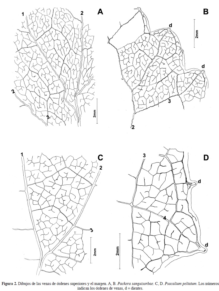 Desarrollo. El patrón de venación se estableció temprano en el desarrollo de la hoja de las cuatro especies estudiadas, originándose en primer lugar la(s) vena(s) primaria(s) y en segundo lugar, en un sentido acrópeto, a lo largo de la(s) vena(s) primaria(s) las venas secundarias. El desarrollo de las venas en estas Senecioneae tuvo un arreglo jerárquico; es decir, los cordones procambiales de las venas primarias se desarrollan antes que en las venas secundarias y así sucesivamente, concordando con lo registrado por varios autores (Foster, 1952; Merrill, 1979; Dengler y Kang, 2001). Además, la formación de las venas de orden superior se produjo más tarde, durante la expansión de la hoja en regiones preformadas. Este patrón de venas superiores no refleja la forma de la hoja como lo hacen las venas de menor orden (Dengler y Kang, 2001). Las vénulas se desarrollaron progresivamente en un proceso ordenado de diferenciación, similar a lo registrado en otras familias de dicotiledóneas (Slade, 1959; Pray, 1963; Merrill, 1979).