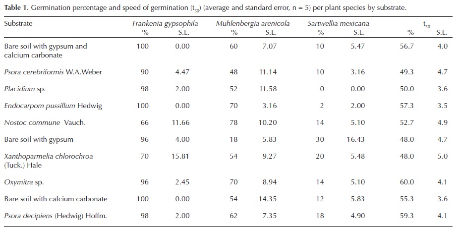 Semiarid grasslands in northeastern Mexico contain endemic plants and animals, and are an important refuge for resident and migratory animals. Here, as in other semiarid areas, biological soil crusts (BSC) are a key component of the ecosystem. However, findings about their effect on the germination of vascular plants are contradictory. We asked whether seed germination of some native plant species would be inhibited by the presence of BSC as it has been found in other studies; in turn, we evaluated the effect of five lichens (Endocarpon pusillum Hedw., Placidium sp., Psora cerebriformis W.A.Weber, Psora decipiens (Hedw.) Hoffm., Xanthoparmelia chlorochroa (Tuck.) Hale), one cyanobacteria (Nostoc commune Vauch.), and one hepatic (Oxymitra sp.), from the dominant BSC of the area on the germination percentage (germinability) and speed of germination (t50) of three native plant species: Frankenia gypsophila I.M.Johnst., Muhlenbergia arenicola Buckl., and Sartwellia mexicana A.Gray. Germination tests were carried out in an environmental chamber at 26 °C and at a constant humidity of 60% with 12:12 hours light and darkness. BSC did not affect germination percentage of the three evaluated plant species when compared to bare soil. Speed of germination ranged between 3.5 and 5 days and there were no differences between substrates.
