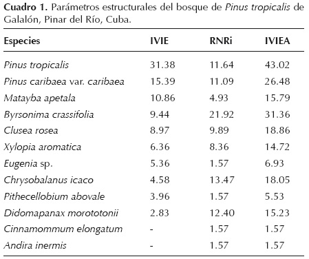 Estructura de bosque. En el cuadro 1 se muestran los parámetros estructurales del bosque natural determinados por el IVIE, RNNi e IVIEA. Los valores del IVIE como resultado de la dominancia, abundancia y frecuencia relativa indicaron que Pinus tropicalis ocupó la mayor importancia ecológica, seguido de P. caribaea var. caribaea y Matayba apetala. El menor valor lo tuvo Didymoponax morototonii. Las especies que presentaron mayor IVIE no coinciden con las de mayor valor de RNRi. El mayor valor de IVIEA lo presentó P. tropicalis, seguido de Byrsonima crassifolia y P. caribaea var. caribaea, resultado que difiere del IVIE dado la mayor RNRi que presentó Byrsonima crassifolia. Para las especies Andira inermis y Cinnamommum elongatum no se reportaron valores de IVIE por presentar diámetros menores de 2.5 cm; sin embargo, fue considerada su RNRi por presentar altura mayor de 2.0 cm, no siendo especies características de la formación de pinares.