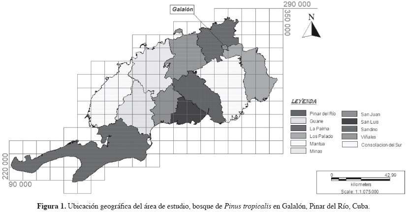 Área de estudio. El área de estudio se localiza en un bosque natural de Pinus tropicalis perteneciente a la localidad de Galalón, ubicada en el municipio La Palma, provincia de Pinar del Río, Cuba. Limita al norte con Cajálbana, al sur con Los Palacios, hacia el este con La Güira y al oeste con Juan Manuel. El área está ubicada entre las coordenadas 22° 11' 780" y 22° 13' 100" de latitud norte, 84° 03' 820" y 84° 05' 130" de longitud oeste. Para su localización se utilizó el mapa de cobertura actual y uso de la tierra del municipio La Palma, mediante interpretación de la base cartográfica del Grupo Empresarial GEOCUBA, utilizando el programa Mapinfo Profesional versión 8.0 (Figura 1).
