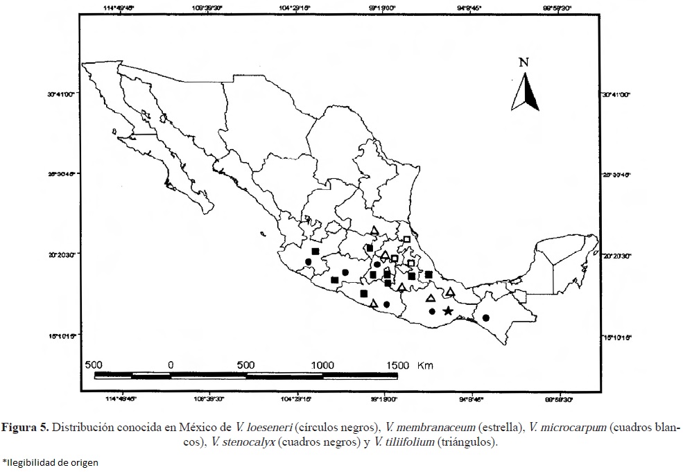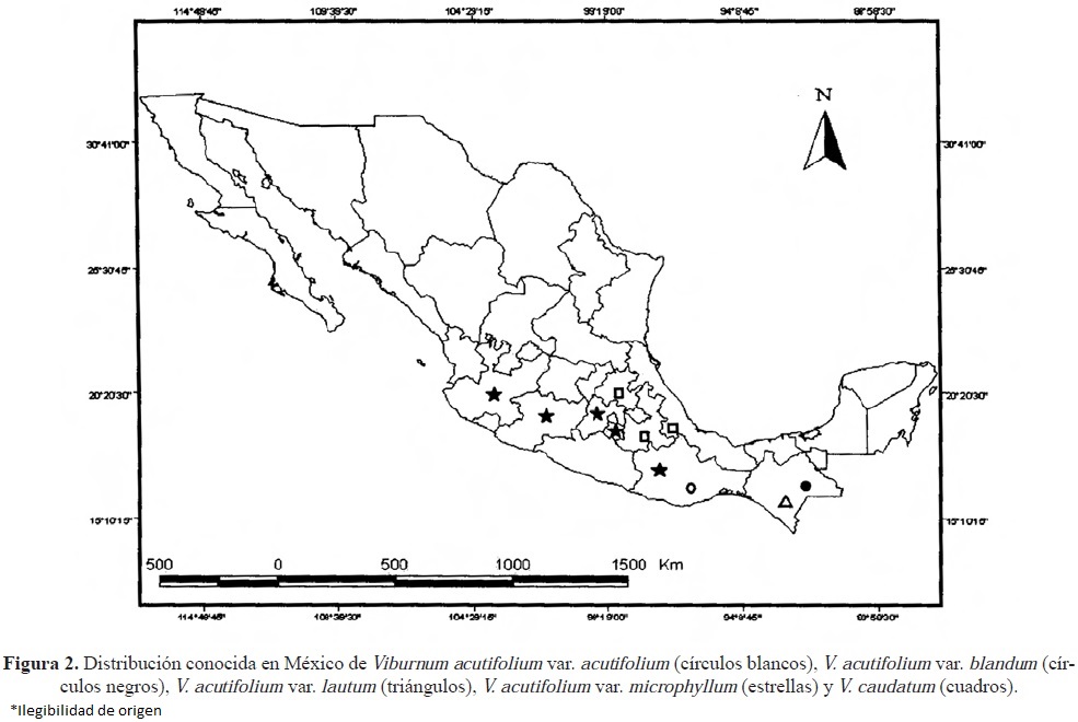 Se reconocen 20 taxones de Viburnum para México, correspondientes a 17 especies, una de ellas con tres variedades adicionales, diez son endémicas de México. El género se distribuye en las regiones montañosas del noreste, centro y sur del país, localizándose en 20 estados, Oaxaca con el mayor número de representantes (12), seguido de Chiapas (9), Guerrero (6), Hidalgo y Veracruz (5), Jalisco, Michoacán y Puebla (4), y otros estados con menor número de especies. Viburnum elatum es la especie más ampliamente distribuida (14 estados), mientras que V. acutifolium var. acutifolium, V. membranaceum y V. sulcatum sólo se les conoce de Oaxaca, V. acutifolium var. blandum y V. acutifolium var. lautum de Chiapas, y a V. rufidulum del norte de Coahuila. Tres combinaciones nomenclaturales no previamente publicadas son incluidas.