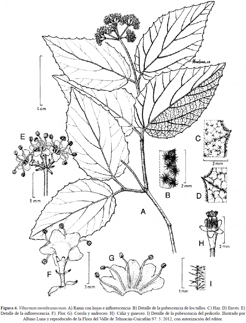 Comentario taxonómico. Viburnum stellatum es reportado para Veracruz (Morton, 1933); sin embargo, al parecer no se ha vuelto a colectar. La revisión del tipo y ejemplares colectados por Pringle para el Distrito Federal, determinados con este nombre, muestran mucha similitud con V. stenocalyx. Esta especie parece estar relacionada con V. membranaceum, al presentar ambos características similares en la forma, textura membranácea y margen ciliado de la hoja, diferenciándose por la densidad de la pubescencia, nervación de la hoja, tamaño del fruto y distribución.