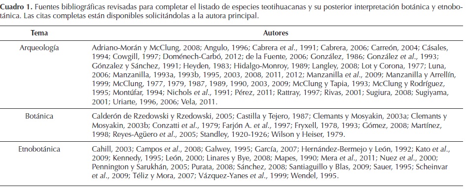 Revisión de las plantas utilizadas por los teotihuacanos. Para compilar el uso de la flora por la cultura teotihuacana se revisaron publicaciones, además de informes arqueológicos reportados al Instituto Nacional de Antropología e Historia (INAH) en torno a Teotihuacan. Se encontraron identificaciones de plantas útiles en sólo 45 investigaciones realizadas entre los años 1977 al 2012. Las citas de estos trabajos se encuentran en el apartado de arqueología del Cuadro 1. En las investigaciones, los taxa fueron identificados a partir de: (1) restos arqueobotánicos procedentes de excavaciones, como son los restos macrobotánicos (semillas, partes de frutos, madera carbonizada, tallos) y los restos microbotánicos (polen y fitolitos); y (2) la interpretación de representaciones de fitomorfos en murales y cerámica.