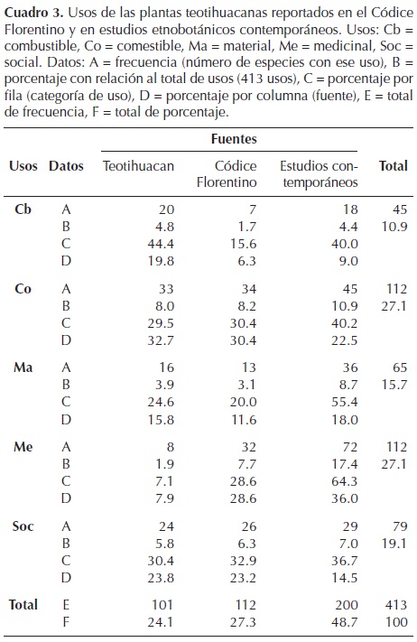 Los 121 taxa tienen 99 usos en Teotihuacan, 112 en el Códice Florentino y 200 en los estudios recientes. Los usos, en las tres fuentes, con más especies son: comestible y medicinal (27%), social (19%), material (16%) y por último, combustible (11%). El uso combustible tiene un mayor número de taxa reportados para Teotihuacan que para las otras fuentes. La proporción en los usos cambia entre Teotihuacan y el Códice Florentino; el comestible es el mayor para ambos, pero el medicinal es mayor en el Códice Florentino. En los estudios etnobotánicos contemporáneos, el principal uso es medicinal.
