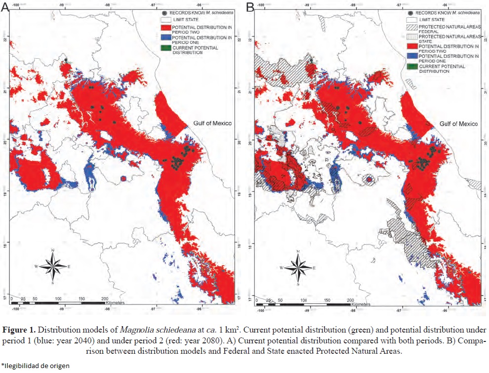 In this study, we evaluated the potential effects of climate change on populations of Magnolia schiedeana, considering the MDI-ECHAM5 scenario in two periods (years 2040 and 2080), using potential distribution models at a spatial resolution of 1 km2. We also identified protected areas suitable for long-term preservation.