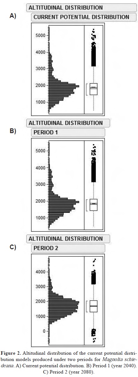 The current potential distribution is at altitude of 1,433-2,135 masl, with an average of 1,882 ± 687 m, decreasing to 1,426-2,118 masl with an average of 1,876 ± 693 (range: 498-5,471 m) in the first period (year 2040), and to 1,291-2,052 masl with an average of 1,710 ± 594 m in the second period (year 2080), which differs significantly under the second period (P < 0.0001) (range: 709-4,837 masl). Figure 2 shows the elevation of the current and future potential distribution of M. schiedeana in which the box on the diagram indicates the greatest potential distribution in both periods (50% of the distribution on the data), and the median corresponding to the center of the box, only being observed in a symmetrical distribution in the second period.