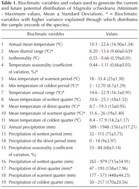 The BIOCLIM software of the package ANUCLIM 6.1 was used to generate 19 bioclimatic variables (Table 1) from the combination of the mean monthly layers of temperature and precipitation above referred, from which the bioclimatic profile of Magnolia schiedeana was also extracted (Lindenmayer et al., 1991; Téllez-Valdés and Dávila-Aranda, 2003; Téllez-Valdés et al., 2004, 2006; Villaseñor and Téllez-Valdés, 2004).