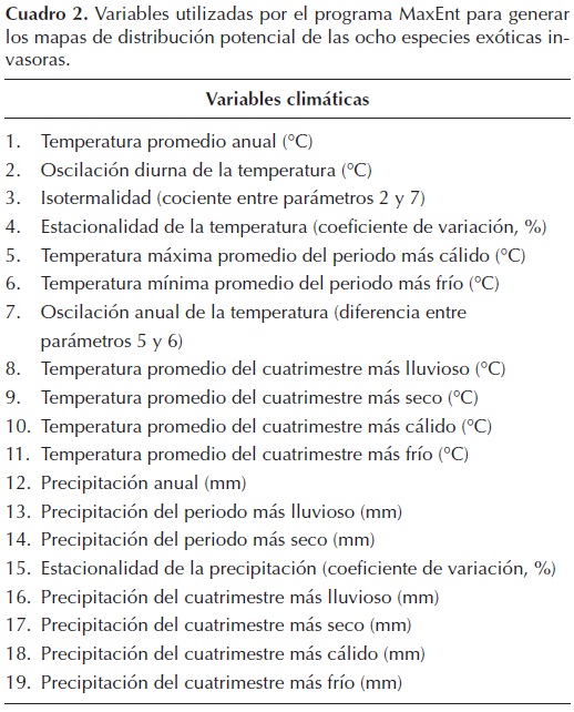 Importancia del uso de modelos de distribución de especies. Debido al impacto potencial de las especies invasoras sobre la estructura de las comunidades biológicas y al funcionamiento de los ecosistemas, se hace necesario conocer su distribución para implementar acciones de manejo y control. Un enfoque fundamental para la comprensión y gestión de especies invasoras es determinar su distribución potencial. Varios trabajos proporcionan una visión general de la modelación de distribución de especies o una comparación de los métodos de modelación (Fielding y Bell, 1997; Guisan y Zimmermann, 2000; Zaniewski et al., 2002; Anderson et al., 2003; Segurado y Araújo, 2004; Guisan y Thuiller, 2005). Estos modelos de distribución de especies tienen por objeto predecir áreas que describan las condiciones ambientales adecuadas para la supervivencia de las especies; es decir, la distribución potencial o nicho fundamental (Anderson et al., 2003; Guisan y Thuiller, 2005). En general, estos métodos de modelación combinan datos de localidades georeferenciadas de las especies donde ha sido confirmada su presencia con variables ambientales, para crear un modelo de requerimientos de la especie de acuerdo a las variables examinadas (Anderson et al., 2003). El modelo resultante es proyectado sobre un mapa de la región de estudio que muestra la distribución potencial de las especies estudiadas. Estos mapas pueden servir para detectar áreas donde las especies invasoras pueden estar presentes y donde posiblemente estarán en el futuro. El clima es un factor importante que afecta o determina la distribución de los organismos; por tal motivo, los análisis de variables climáticas ayudan a comprender el por qué una especie crece en un determinado sitio y no en otro (Lindenmayer et al., 1991).