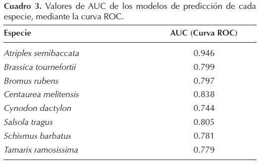 Evaluación de la capacidad de predicción de los modelos y variables importantes. La eficiencia de predicción de los modelos muestra que las especies se encuentran en el intervalo del valor de AUC (curva ROC), de 0.744 a 0.946. Así, de acuerdo a los valores considerados por Araújo y Guisan (2006), Brassica tournefortii, Bromus rubens, Cynodon dactylon, Schismus barbatus y Tamarix ramosissima tienen una precisión del modelo clasificada como promedio; Centaurea melitensis y Salsola tragus, con una clasificación de precisión del modelo como buena; y sólo Atriplex semibaccata tiene una clasificación de precisión del modelo excelente (Cuadro 3).