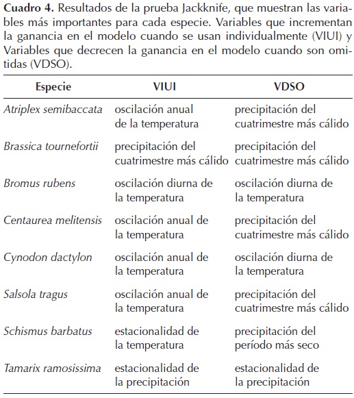 La mayoría de los modelos aumentan su ganancia con variables relacionadas a la temperatura, cuando estas son usadas individualmente. En el caso de Atriplex semibaccata, Centaurea melitensis, Cynodon dactylon y Salsola tragus, la variable climática que más contribuye es la oscilación anual de la temperatura, mientras que para Bromus rubens y Schismus barbatus, la oscilación diurna de la temperatura y la estacionalidad de la temperatura son, respectivamente, las variables más influyentes. Las únicas especies que están más relacionadas a variables de precipitación cuando son usadas individualmente son Brassica tournefortii y Tamarix ramosissima. Contrariamente, las variables climáticas más importantes, que disminuyen la ganancia en los modelos cuando son omitidas, son las relacionadas a la precipitación. Para Atriplex semibaccata, Brassica tournefortii y Centaurea melitensis, resalta la variable de precipitación del cuatrimestre más cálido, y para Schismus barbatus y Tamarix ramosissima sobresale la precipitación del periodo más seco y la estacionalidad de la precipitación, respectivamente. En el resto de las especies, las variables relacionadas a la temperatura cuando son omitidas resultan tener más influencia (Cuadro 4).