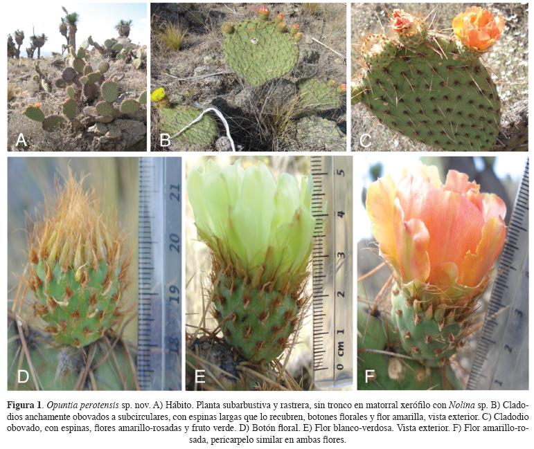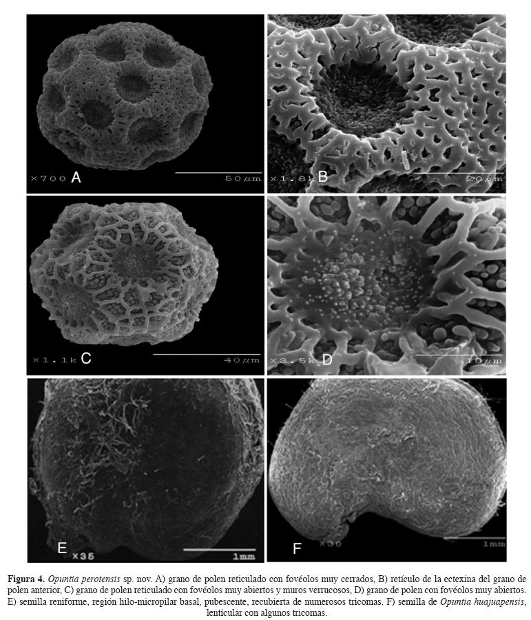 Planta subarbustiva a rastrera, de 60-90 cm de altura, terrestres y rupícolas (Figura 1A). Raíces fibrosas. Tronco ausente. Cladodios encadenados extendidos, ascendentes y decumbentes, obovados, anchamente obovados a subcirculares, brillantes, de 20 × 16.5 cm, verde-amarillentos, con podarios elevados (Figura 1B); epidermis papilosa; estomas ciclocíticos (Figura 2A). Aréolas dispuestas en 11-12 series, distantes 0.8-1.5 cm entre sí y 0.9-1 cm entre series, circulares, obovadas o elípticas, ca. 3 mm de largo o de diámetro, con fieltro marrón-negruzco (Figura 1B-C). Glóquidas amarillas, dispuestas en la parte superior de la aréola, como de 1 mm de largo (Figura 2B). Espinas con barbas retrorsas largas y elevadas, el ápice rojizo o marrón (Figura 2C), y la región media con 26 células paralelas entre sí, sin espacios intercelulares (Figura 2D); cerdas marrón-amarillentas, rojizas o marrón, el ápice amarillo, encorvadas des-de la base, las radiales 2-8; en la parte inferior de la aréola, reflejas, de 1.5- 2.6 cm, cerdosas o setosas, onduladas, más numerosas en los bordes, de 0.4-0.9 cm de largo; las centrales 1-3, reflejas, de 3-4.1 cm de largo, más rígidas y más oscuras que las radiales; cerdas inferiores 1-5, onduladas, blanquecinas a grisáceas. Botón floral con pericarpelo con seis series de aréolas, con escamas basales blancas, ascendentes, lana marrón y cerdas apicales amarillas (Figura 1D). Flores diurnas, una en cada aréola, de 4-5 × 4.5-6 cm, pericarpelo subcircular, de 1.5 cm de diámetro, con aréolas elípticas, dispuestas en 6 series, con pelos blanco-rosados, hojas de las aréolas basales anchas, oblongas, con el ápice agudo y bordes ondulados; glóquidas en la parte superior de la aréola, amarillas; espinas radiales hasta 6, ascendentes, hasta 0.4 cm de largo, rojas; espina central 1, ascendente, hasta 1 cm de largo, roja con el ápice amarillo; segmentos exteriores del perianto espatulados, apiculados, margen ondulado, de 1.3-2 × 0.7-1.2 cm, amarillo-verdosos, blanco-verdosos, amarillos o color rosa-amarillento (Figuras 1E-F); estambres numerosos, alcanzan la parte mediana de los segmentos interiores del perianto, amarillo pálidos, pasando al segundo día a color de rosa; estilo alcanza casi la misma altura de los estambres, de color amarillo-verdoso, lóbulos del estigma 10-12, en dos series paralelas entre sí, verdes o color rosa (Figuras 3A-C)(B). Polen de dos tipos: uno con 12 poros y forámenes amplios (Fig. 4A-B) y, otro con 20 poros y forámenes muy cerrados (Figura 4C-D), Frutos amarillos, subglobosos a cilíndricos, de 4-5 × 3.5 cm, paredes exteriores con 5 series de aréolas elípticas, fieltro marrón, cerdas cortas, ascendentes, blancas y amarillentas, las superiores más largas, sin espinas, pare-des interiores de 1.5 cm de ancho; cicatriz floral hundida, de aprox. 3 cm de diámetro, color rosa (Figuras 3D-F)(E). Semillas aproximadamente 81 en cada fruto, dispuestas en el centro del fruto, reniformes, de 3 mm de diámetro, color crema, arilo seminal con tricomas largos, pluricelulares, agrupados en haces dispersos en toda la semilla; parte lateral del arilo angosto, irregular, región hilo-micropilar basal (Figuras 4E). La semilla de Opuntia huajuapensis es lenticular con algunos tricomas (Figuras 4F).
