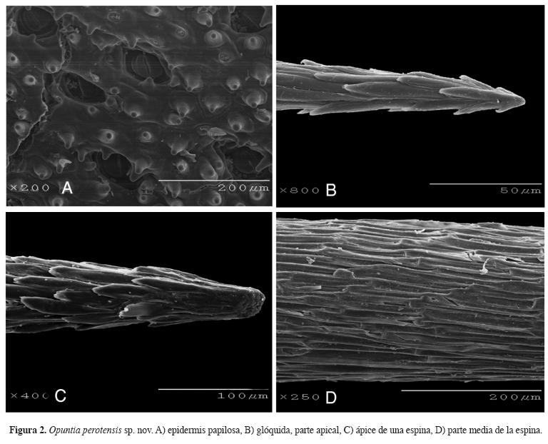 En la presente investigación se describe e ilustra una nueva especie del género Opuntia, que se distribuye en el Frijol Colorado, Cofre de Perote, Veracruz, incluyendo características macromorfológicas de los órganos vegetativos y reproductivos y, micromorfológicas, vistas con el microscopio electrónico de barrido, de glóquidas, espinas, granos de polen y semillas.