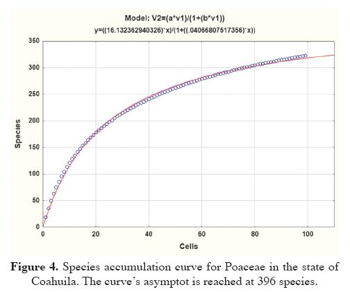 Species accumulation curve. The species accumulation curves, because they consider rarity or abundance, are important emerging tools for estimating floristic richness from a place or region (Koellner et al., 2004). To evaluate how exhaustive the Poaceae inventory was in the herbaria studied, we obtained a species accumulation curve by using EstimateS version 8.2.0 software (Colwell and Coddington, 1994; Colwell, 2009). As a measure of the collecting effort, we considered the 20 arc minute cell size and we calculated the estimated richness using a parametric coefficient based on Clench's function (Jiménez-Valverde and Hortal, 2003) using Statistica version 10 software (StatSoft Inc., 2011). This function is now widely used to estimate the accumulation curves of the expected floristic richness. Soberón and Llorente (1993) explain with details Clench's function and discuss its usefulness and limitations in biological inventories.
