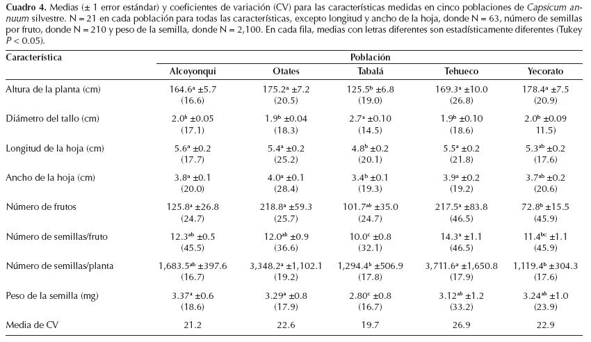 La comparación de medias reveló que las poblaciones se diferenciaron significativamente para todas las características fenotípicas medidas (Cuadro 4). La población Tabalá mostró los valores más bajos para la mayoría de las características. Esta población mostró los valores promedio menores en altura de planta, longitud de hoja, ancho de hoja, número de semillas por fruto y peso de semillas, pero tuvo el mayor diámetro de tallo (Cuadro 4). La población Yecorato tuvo el menor número de frutos y el menor número de semillas por planta. La población Tehueco mostró el mayor número de semillas por planta. Las poblaciones Alcoyonqui y Otates tuvieron las semillas de mayor peso (Cuadro 4).