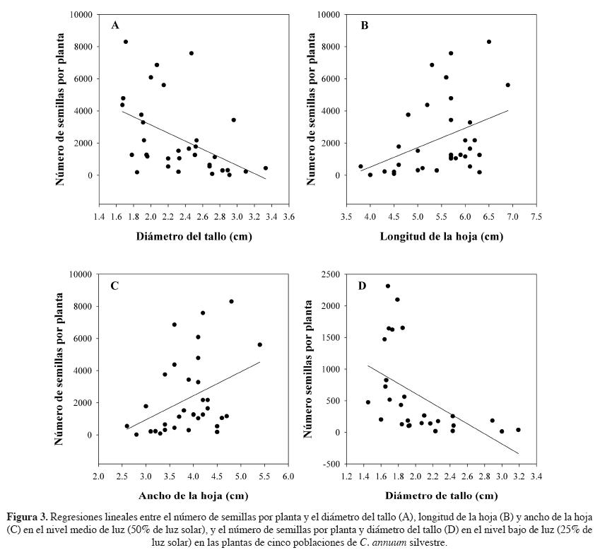 Relaciones entre las normas de reacción y capacidad reproductiva. En el tratamiento medio de luz hubo una relación positiva y significativa entre el número de semillas por planta y la longitud (r = 0.390, P = 0.0261; Figura 3B) y ancho de la hoja (r = 0.390, P = 0.0265; Figura 3C). En este mismo tratamiento, el número de semillas por planta se correlacionó negativa y significativamente con el diámetro del tallo (r = - 550, P = 0.0049; Figura 3A). En el nivel bajo de luz, el número de semillas por plantas se correlacionó negativa y significativamente con el diámetro del tallo (r = -0.510, P = 0.0057; Figura 3D). Ninguna otra correlación entre el número de semillas por planta con las demás características fenotípicas fue significativa en los tratamientos bajo, medio y alto de luz.