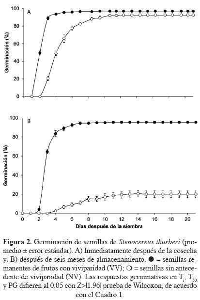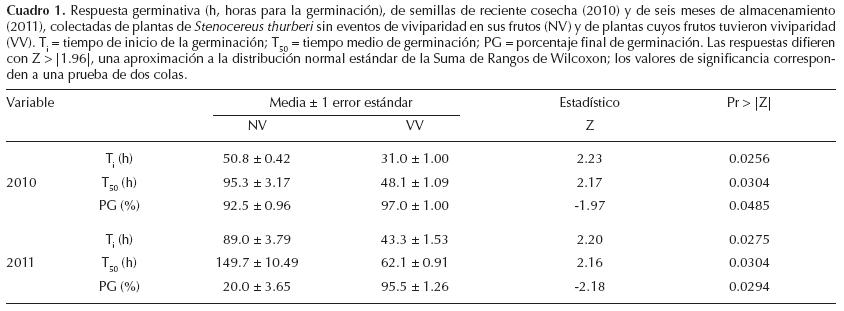 En cuanto a la velocidad de germinación, las semillas vivíparas de Stenocereus thurberi tardan dos días menos que las no vivíparas para alcanzar el 50% de la germinación potencial; por lo tanto, la germinación es más rápida en las semillas que proceden de frutos donde hubo hallazgos de viviparidad; esta característica facilitaría la probabilidad de establecimiento en medios con precipitación intermitente o escasa (Dubrovsky, 1996, 1998; Yang et al., 2003). Las semillas de S. thurberi, igual que las de otras cactáceas, maduran y son liberadas desde principios del verano, antes de iniciar la estación lluviosa (Pimienta-Barrios y Nobel, 1998; Flores y Briones, 2001). En este contexto, la progenie vivípara y las semillas hermanas no germinadas dentro de los frutos tendrían mayor tiempo en la estación húmeda para convertirse en plántulas, con mayores reservas y vigor, cualidades que asegurarían la supervivencia durante la estación seca (Baskin y Baskin, 1998; Pritchard et al., 2004).