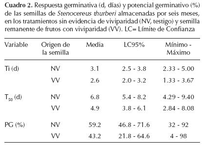 Las semillas del grupo no vivíparo germinaron bien al sembrarlas inmediatamente a la cosecha, en comparación con la respuesta posterior a los 6.5 meses de almacenamiento (20%). Probablemente, la desecación de los tejidos o la temperatura de almacenamiento afectaron la funcionalidad temporal o definitiva de los tejidos embrionarios, causando latencia secundaria ante los cambios térmicos y de humedad, lo que implicaría que aún después de liberarlas de la condición de almacenamiento, no pudiesen germinar a pesar de ofrecerles condiciones favorables. Por esta respuesta, se acepta que hay germinación post-almacenaje al comparar las semillas de ambos tipos (NV y VV), con diferencias estadísticas en la capacidad germinativa. La respuesta de germinación post-almacenamiento registrada, no está generalizada en el grupo NV de Stenocereus thurberi, ya que otros autores (además de que no han referido viviparidad), han registrado 66% de germinación en semillas de uno a dos meses de cosecha (Yang et al., 2003), y 85 a 93% en semillas de cinco meses (Sánchez-Soto et al., 2010). Para Epiphyllum phyllanthus, Simâo et al. (2010) reconocen que aún después de 12 meses de almacenamiento, las semillas (sin precocidad) originadas de progenitores vivíparos, siguen siendo germinables.