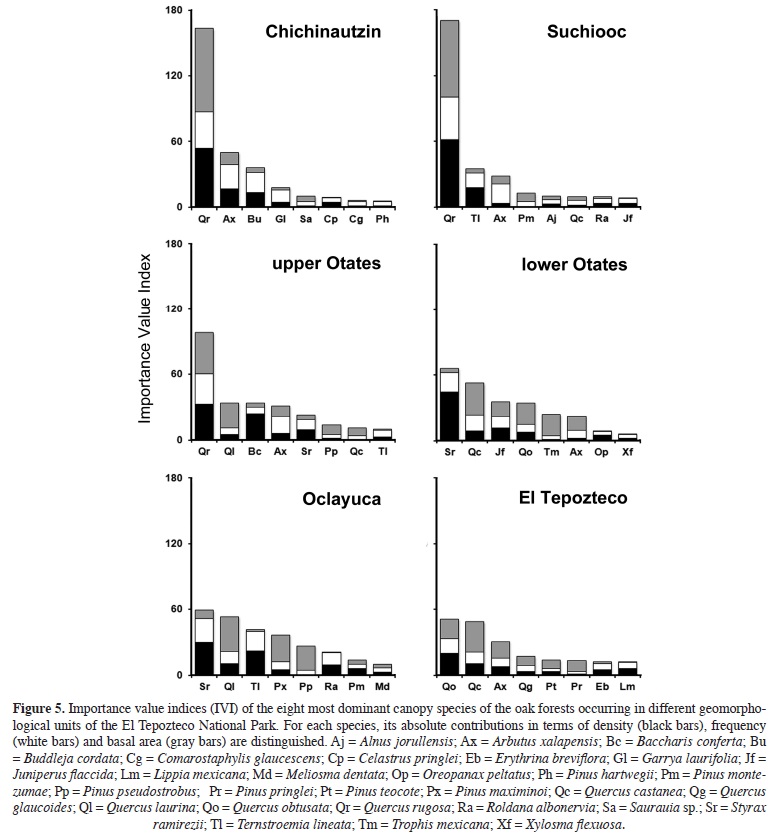 The IVIs of canopy species recorded in more than one geomorphological unit were highly variable among them (Figure 5). Quercus rugosa was dominant in Chichinautzin, Suchiooc and upper Otates. In Chichinautzin, this species' IVI was three times higher than the one for Arbutus xalapensis, the secondmost dominant species. While Q. rugosa occurred in nine of ten plots in Chichinautzin and Suchiooc, half of the canopy species in those units were recorded in a single plot only. In Suchiooc, Q. rugosa contributed with ca. 60 % of the total density and 70 % of the total basal area, while its IVI was five times higher than that for Ternstroemia lineata, the secondmost dominant species in that unit. Contrastingly, dominance of this oak species was less marked in upper Otates, where Quercus laurina, Baccharis conferta and Arbutus xalapensis followed it closely in terms of IVI. Interestingly, a different structural variable made the largest contribution to the IVIs of each of these species: basal area for Q. laurina, density for B. conferta, and frequency for A. xalapensis.