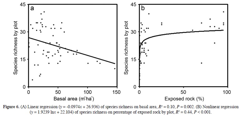 In the absence of precise information, the percentage of exposed rock in a plot can be used as a proxy for substrate heterogeneity for plants. To gain a better insight about the relationships between richness and productivity, and between richness and environmental heterogeneity, we performed regression analyses of the number of species on basal area and on percentage of exposed rock. Both regressions were significant, i.e., the number of species in the plots significantly decreased with increasing basal area, whilst it was positively related to the percentage of exposed rock (Figure 6). However, basal area only explained a small fraction of the variance in species richness (ca. 10 %), while the percentage of exposed rock explained 44 % of such variance. In fact, the richnessbasal area relationship can be described as triangular, as richness was considerably more variable among plots with low basal area, whereas high basal area was always associated with low richness (Figure 6A). In plots with low basal area, low richness can also be due to anthropogenic disturbance; in the absence of this factor, plots could potentially contain more species. Further, intrinsic mechanisms that limit species richness may also operate in plots with high basal area, independently of extrinsic factors like anthropogenic disturbance. For example, large trees may cast deep shade, thus creating a lightlimited environment at ground level; this would in turn constrain the growth potential of herbaceous plants, which is, as discussed earlier, the vegetation component with the largest contribution to species richness in this forest (Mooney and Ehleringer, 1997). In addition to light limitations, plots with larger trees tend to have a higher litter accumulation, which may hinder plant recruitment (Facelli and Pickett, 1991; MejíaDomínguez et al. 2011). In our study, the species with the largest contributions to total basal area in the forests were oaks and pines, whose litter is particularly difficult to decompose due to high contents of tannins and terpenes, respectively (Schulze et al., 2002). Because of their slow decomposition, the litter of these trees (especially of pines) tends to accumulate in the soil. The largest structural contribution of pines was observed in the Oclayuca forest, which could partially explain the low richness of its understory community.