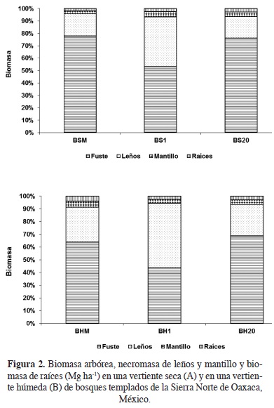 Biomasa y necromasa: el factor aprovechamiento forestal. En el presente estudio se evidenció la mayor sensibilidad de los compartimentos de la biomasa aérea y de la necromasa de los bosques templados al aprovechamiento después de 1 y 20 años de la explotación. La biomasa arbórea de los bosques maduros y aprovechados en la comunidad de Ixtlán de Juárez varía entre 141 y 347 Mg ha1; éstos rangos y magnitudes son comparables a los reportados para otros bosques templados (100 y 380 Mg ha1; Tateno et al., 2004; White et al., 2004; Park et al., 2008). La biomasa arbórea de los bosques maduros en ambas vertientes fue mayor a la observada en los bosques con menos tiempo de abandono después del aprovechamiento (p. ej., bosque de 1 año), como consecuencia del "adelgazamiento" en la densidad de árboles ya que generalmente los fustes contribuyen con el 70 a 95 % a la biomasa aérea (Figura 2). Por otra parte, el ecosistema demostró una buena capacidad de resiliencia al recuperar sus valores de biomasa solo 19 años después, si se tiene en cuenta que ecosistemas similares tardaron el doble de tiempo en alcanzar la acumulación de biomasa previa al aprovechamiento (Porté et al., 2002; BalboaMurias et al., 2006; Peichl y Arain, 2007 y GarcíaGonzalo et al., 2007). La rápida recuperación de la biomasa del bosque podría ser consecuencia de la baja extracción arbórea (sólo 25,000 m3 año1), que podría favorecer el incremento diamétrico; es decir, que la extracción arbórea selectiva mejora las condiciones de crecimiento para los árboles remanentes, y por lo tanto la recuperación de la biomasa aérea (SmartWood, 2001).