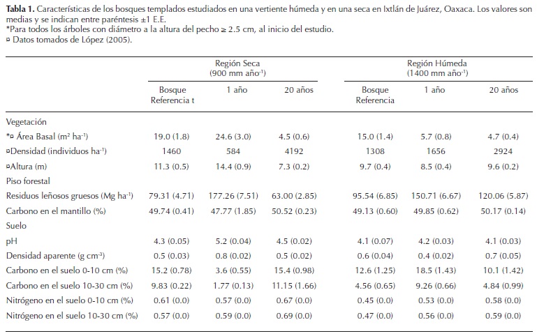 Análisis estadístico. La variación en la biomasa aérea, la masa de mantillo, las raíces y los residuos leñosos gruesos y sus componentes fueron explorados mediante el análisis de varianza de dos factores (región climática y edad del bosque). Cuando un factor fue significativo se realizaron comparaciones múltiples con la Prueba de Tukey (P > 0.05) corregida por Bonferroni (P = 0.05). Los análisis estadísticos se realizaron con el paquete estadístico SPSS versión 10.0 para Windows.