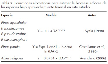 Determinación de la biomasa aérea. En los bosques elegidos se establecieron cinco parcelas de 10 × 50 m en junio de 2003. En cada parcela se determinó para cada árbol su especie y se midió su diámetro a la altura del pecho (DAP, 1.30 m altura) y su altura (m). También se determinaron la densidad de árboles (tallos ha1), el área basal (m2 ha1) y la biomasa (Mg ha1). La biomasa arbórea (Mg ha1) se obtuvo por medio de la utilización de ecuaciones alométricas a partir de las estructuras diamétricas (Tabla 2).