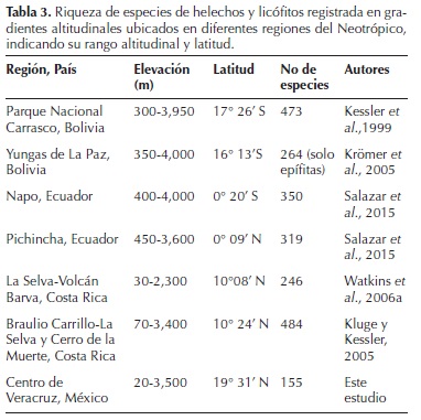 Los datos de la alta riqueza de especies presentados, muestran la importancia de este gradiente por su gran aporte a la pteridoflora a nivel regional. Sin embargo, si contrastamos estos datos con otras zonas del Neotrópico cercanas al Ecuador resultan notablemente menores (Tabla 3). Esto coincide con el gradiente de diversidad latitudinal, en el cual el número de especies de helechos y licófitos por unidad de área aumenta conforme se acerca al Ecuador y se aleja de los polos (Moran, 2008; Salazar et al., 2015), aunque los estudios realizados en Bolivia entre 1416° de latitud Sur demuestran la extraordinaria riqueza de los bosques húmedos de los Andes (Krömer et al., 2005; Kessler et al., 2011a).