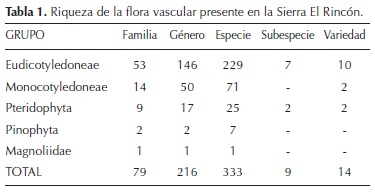 Se analizó la riqueza taxonómica, el hábito y la forma de vida, la presencia de especies nativas e introducidas, la flora sinantrópica, los patrones de distribución y endemismo, además del estado de conservación de las especies vegetales presentes en la Sierra El Rincón. Con esta información se elaboró un listado florístico (Apéndice), siguiendo las propuestas de clasificación de Mickel y Smith (2004) para Pteridophyta y grupos afines; Farjon (2001) para Pinophyta y los del APG III (2009) para angiospermas. Los nombres científicos se citan de acuerdo con el Índice Internacional de Nombres de Plantas (IPNI por sus siglas en inglés) <www.ipni.org> (consulta mayo 2014) y a la base de datos del Missouri Botanical Garden W3 Tropicos <www.tropicos.org> (consulta mayo 2014).