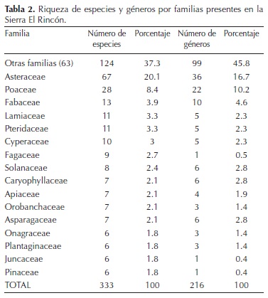 Inventarío florístico. La flora de la Sierra El Rincón está representada por 79 familias, 216 géneros, 333 especies, nueve subespecies y 14 variedades (Apéndice). El grupo que presentó la mayor riqueza fue Eudicotyledoneae, seguido de Monocotyledoneae, Pteridophyta, Pinophyta y Magnoliidae (Tabla 1). La familia mejor representada fue Asteraceae con 36 géneros y 67 especies, seguida de Poaceae (22/28), Fabaceae (10/13), Lamiaceae (5/11), Pteridaceae (5/11) y Cyperaceae (5/10). En estas seis familias se encuentra representado el 38.1 % (83) de los géneros y el 42 % (140) de las especies. Las 73 familias restantes registraron menos de diez especies cada una (Tabla 2).