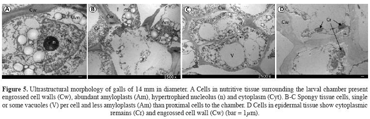 When gall size increases to 14 mm of diameter, some structural changes were observed in their cell layers. The nutritive cells showed hypertrophy of nucleus and nucleolus, the nucleus appears segregates less dense and less compact, the nucleolus present blanched regions, the morphology the nutritive cells are similar to the spongy cells in galls of 6 mm of diameter (Figure 5A). The number of amyloplasts increased in nutritive cells (Figure 5A), than in previous sizes (6 mm in diameter) (Figure 3A), and large vacuole fragmented occurred (Figures 2D, 5A). The cells of spongy tissue had a few amyoplasts, appear cytoplasmic remains, a thickened cell wall, few cells had nucleus and nucleolus and the vacuoles were fragmented (Figures 2E, 5B, C). In the epidermal cells thickened cell walls and few cytoplasmic remains can be observed (Figures 2F, 5D). The epidermal cells did not show chloroplasts compared with the smaller galls that had a large number of chloroplasts (Figure 3H); only thickened cell walls and few cytoplasmic remains can be observed (Figures 2F, 5D).