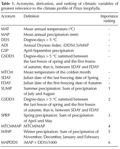 Bioclimate model. The 34-variable model produced a classification error that averaged 4.6 % across the ten 'forests'. As variables were eliminated in the stepwise procedure, this error fluctuated between 4.5 % (for 31 variables in the model) and 5.2 % (for 3 variables in the model). Errors for the 2-variable model increased to 6.1 % and to 20.1 % for one-variable model. The lowest error with a small number of variables was for the 6-variable model which, when run anew to produce the bioclimate model, had an error of 4.6 %, with errors caused by predicting Pinus leiophylla to be present when absent averaging 7.2 % while those caused from predicting P. leiophylla to be absent when present were nill (0.79 %). The six climatic variables, listed in order of importance, were: SUMP, GSDD5, SPRP, MTCMMAP, WINP, and MAPDD5 (Table 1).