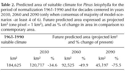 Future suitable habitat for Pinus leiophylla. Predicted suitable habitat for P. leiophylla for the decades centered around 2030, 2060, and 2090 (Figure 2) is based on the consensus of six projections. In this figure, current area is determined by > 50 % of the votes from the classification tree, but future predictions require agreement of at least four of the six projections before being accepted as a likely prediction. The figure suggests a reduction of the climatically suitable habitat for P. leiophylla, by 35 % in relation to the period of normalization 1961-1990 area by 2030, 50 % by 2060, and by 76 % by 2090 (Table 2).