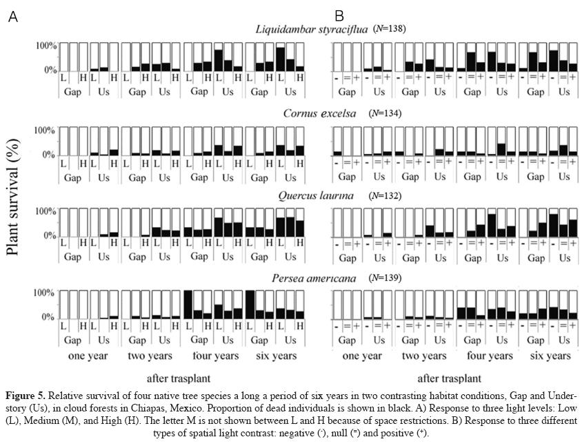 Las dificultades para medir a pequeña escala la heterogeneidad de luz en el sotobosque se refleja en la clasificación de especies, convencionalmente basada en su respuesta al claro o a la sombra, condiciones rara vez uniformes en el espacio y el tiempo. La heterogeneidad espacial y temporal expresada por el contraste entre la luz directa sobre un área (luz vertical) y la luz sobre sus alrededores, permitirá mejorar la estimación del ambiente de luz del sotobosque y de la respuesta de las especies a sus variaciones. Analizamos con medidas repetidas el efecto de luz vertical, contraste y distancia al claro sobre el desempeño de plántulas trasplantadas de Alnus acuminata, Cornus excelsa, Liquidambar styraciflua, Quercus laurina y Persea americana. Los Altos de Chiapas entre 1999 y 2005, en ocho parcelas de bosque de pino-encino, cada una con un claro central pequeño. Evaluamos la iluminación mediante fotografías hemisféricas al principio y al final del estudio. Se midió esbeltez y supervivencia a uno, dos, cuatro y seis años del trasplante. Distancia afectó la supervivencia de Alnus y Liquidambar. Luz vertical explicó esbeltez de Liquidambar. Contraste explicó esbeltez de Liquidambar, Cornus y Quercus y supervivencia de Liquidambar, Quercus y Persea, condicionada a la edad de la planta. La condición inicial de contraste inicial predijo la final, no así la luz vertical. El contraste entre dos gradientes del mismo recurso aumentó notablemente su poder predictivo sobre el desempeño de las especies al describir las pequeñas variaciones de luz en el sotobosque.