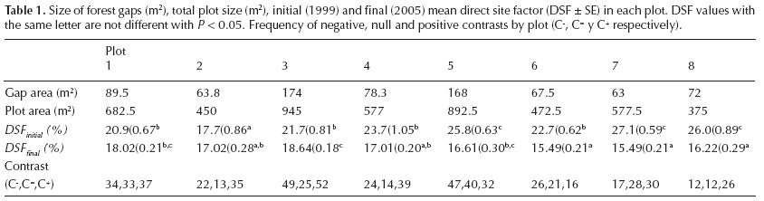 Analysis. Seedling height and diameter were measured at the time of transplant (1999), and one, two, four, and six years later. Stem slenderness ratio of each species (SS) was analyzed for all plants alive six years after transplantation, to determine the long-term effects (regarded as fixed effects) of the three distance to the center of the gap (D) classes (Gap, Edge and Understory), of three Vertical light levels (low, medium and high), and of the three types of light Contrast (C-, C=, C+). Predictive power of initial DSF over what was measured six years later was compared with what happened with the light contrast using a linear regression. Stem slenderness was analyzed using a repeated measures two-way ANOVA along years (Y) and final DSF (2005) as random effects, allowing for the particular successional development effects at each growth area. The significance of differences in stem allometry was assessed with Tukey's posterior test. We contrasted two ANOVA models, with the initial heterogeneity components Vertical light and Contrast as factors not in the same model as they represent two light heterogeneity gradients (one-dimensional and bi-dimensional, respectively) whose temporal elasticity we intend to analyze separately. Plant survival was analyzed for each species with binary logistic regression (backwards procedure) as a function of D, SSt-1 ; VL, and C. The SS ratio entered was that of the previous time to the one at which death was recorded. All statistical analyses were performed using IBM-SPSS version 19 (2010).