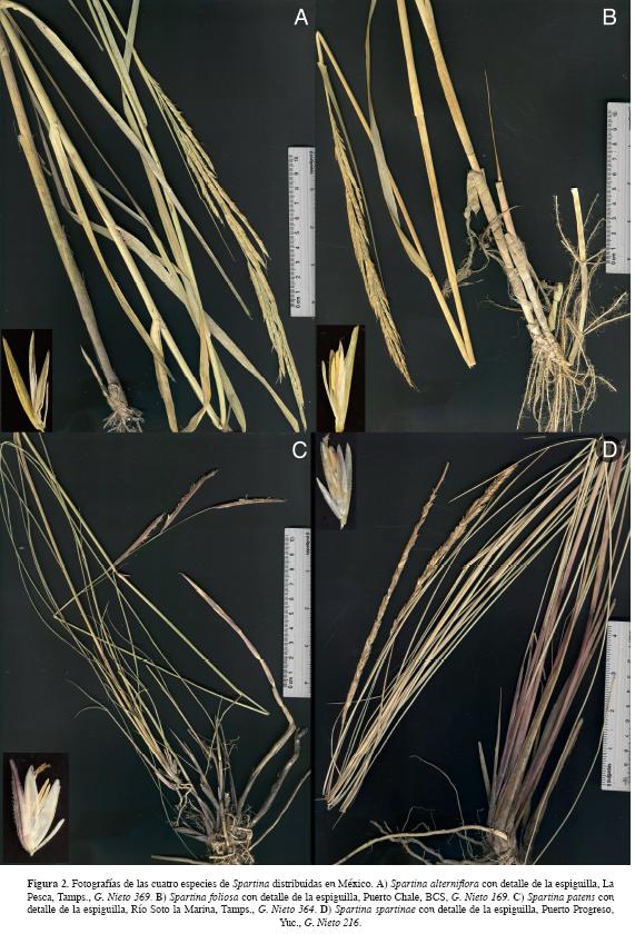 Spartina is a distinctive grass genus because of its processes of dispersal, survival and evolution. It grows in ecosystems of tidal marshes, mudflats and saline basins. The genus is distributed mainly along the entire Atlantic coast, on the Pacific coast only in Baja California, Sinaloa and Oaxaca, and in inland areas of Coahuila and San Luis Potosi. All species are polyploid with a great capacity for hybridization. Frequently species of Spartina have been used in restoration of areas with soil loss; however in many cases they have become invasive weeds. To date, there has not been carried out an exclusive and comprehensive study of this genus in Mexico. The aim of this project was to determine the number of species of Spartina and their distribution in the country. Based on bibliographic and herbarium voucher information, field explorations were carried out in all Mexican localities where Spartina had been reported. Four out of the six species reported for Mexico were found: S. alterniflora, S. foliosa, S. patens, and S. spartinae, the latter being the most widely distributed. Reports of S. gracilis in Jalisco and S. cynosuroides in Chihuahua were noted; however, these species were not located in field explorations nor in herbarium collections. There is no evidence of any introduced species.