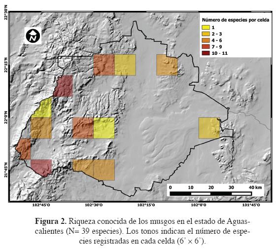 Riqueza conocida. La riqueza conocida hasta la fecha (39 especies) no se distribuye de manera homogénea en el estado de Aguascalientes; las 15 localidades que la base de datos reporta alojan los 109 registros de las 39 especies (Figura 1). De hecho, solamente 13 celdas, de un total de 70 en que se dividió al estado, registran especies de musgos según especímenes herborizados; en las otras 57 celdas no hay registro de especies (Figura 2). Las dos celdas que registran la mayor riqueza (11especies, Figura 2, Tabla 2) se encuentran sobre la Sierra Madre Occidental, en la Sierra Fría (celda 18) y la Sierra del Laurel (celda 59).