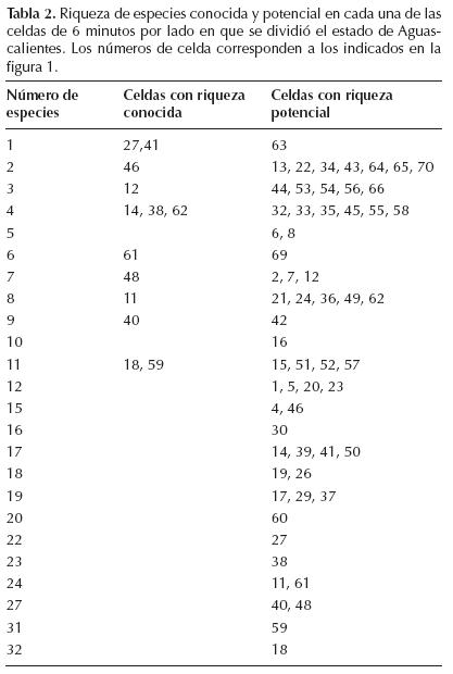 Los datos de distribución conocidos de las 39 especies con registros fehacientes en Aguascalientes y los modelos de nicho ecológico de las 41 especies presentes en Jalisco y Zacatecas, y proyectados hacia Aguascalientes, fueron cruzados contra la malla de seis minutos para obtener el número potencial de especies por celda.