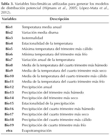 Se consideraron 20 variables como predictores potenciales (Tabla 3), cada una con una resolución de 1 km2, para los estados de Aguascalientes, Jalisco y Zacatecas. Las variables utilizadas se describen con mayor detalle en Cruz-Cárdenas et al. (2012).