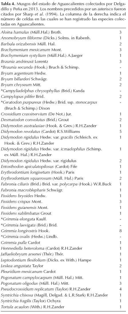 Consideraciones florísticas. La lista de la Tabla 4 contiene un total de 45 taxa específicos o infraespecíficos para la flora de musgos del estado de Aguascalientes. De ellas, 38 son nuevos registros para esa flora, seis fueron citadas en Sharp et al. (1994), y una fue colectada por nosotros, pero había sido registrada previamente. A continuación se ofrecen algunas observaciones sobre esos taxa. La presencia de Braunia secunda debe confirmarse mediante la revisión de los ejemplares que motivaron su inclusión en Sharp et al. (1994) o a través de ejemplares del campo. Braunia secunda y B. andrieuxii se habían considerado como sinónimos, pero De Luna y Gómez-Velasco (2008) mostraron que había diferencias significativas por las que, por el momento, los dos nombres deben retenerse como parte del listado de especies. Grimmia elongata, G. laevigata y G. ovalis representan conceptos específicos que han permanecido relativamente estables, pero se necesita confirmar su existencia como parte de la flora estatal a través de la revisión de los ejemplares originales o de la recolección de otras muestras. Grimmia longirostris también fue citado por Sharp et al. (1994).