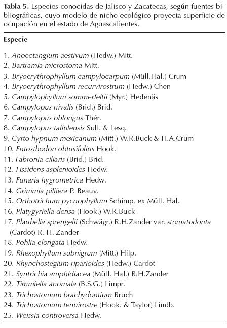 Con los datos de herbario se obtuvieron los registros de 45 especies presentes en Jalisco y Zacatecas, pero no en Aguascalientes; solamente 41 de ellas tuvieron los registros suficientes para elaborar los modelos, con el objetivo de complementar el conocimiento de la flora briológica del estado de Aguascalientes. Para cada especie hubo de 3 a 62 registros; cuatro especies no contaban con el número mínimo (3 registros) considerado en el presente trabajo para elaborar los modelos de nicho ecológico.
