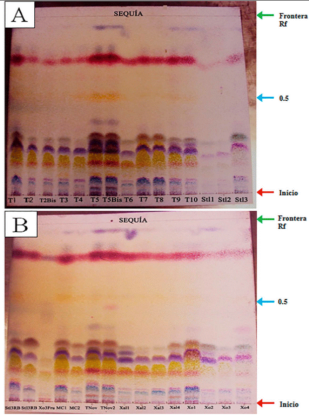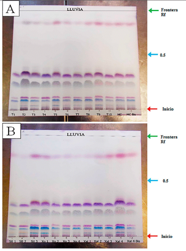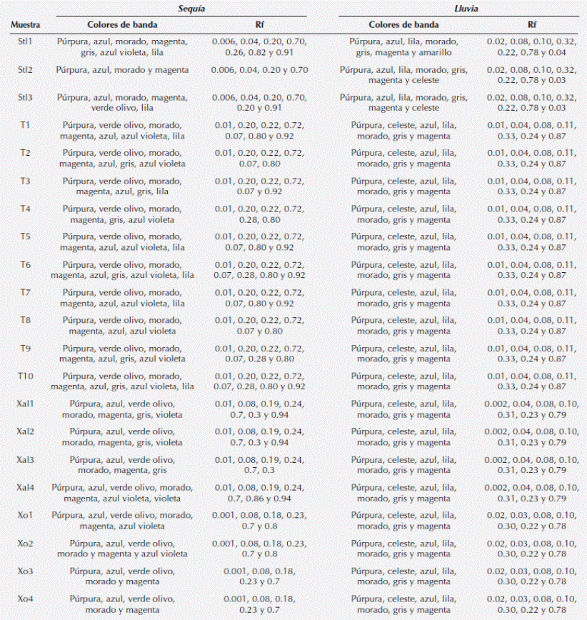En sequía se observaron tres bandas en todas las muestras de resina, que corresponden a bandas en color púrpura (Rf entre 0.001-0.2), morado (Rf entre 0.2-0.3) y magenta (Rf entre 0.65-0.7). En la temporada de lluvia se observaron cinco bandas sobresalientes en todas las comunidades, las bandas corresponden a los colores azul (Rf entre 0.08-0.09), lila (Rf entre 0.09-0.12), morado (Rf entre 0.30-0.34), gris (Rf entre 0.21-.024) y magenta (Rf entre 0.78-0.87).
