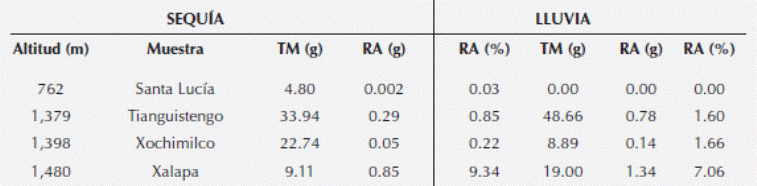 Tabla 3 Rendimiento de aceites esenciales obtenidos de resinas de Liquidambar styraciflua colectadas a diferentes altitudes, en dos épocas del año. TM (g): Tamaño de la muestra en gramos; RA (g): Rendimiento de aceite en gramos; RA (%): Porcentaje de rendimiento de aceite. El número de árboles muestreados por comunidad puede observarse en la Tabla 1.