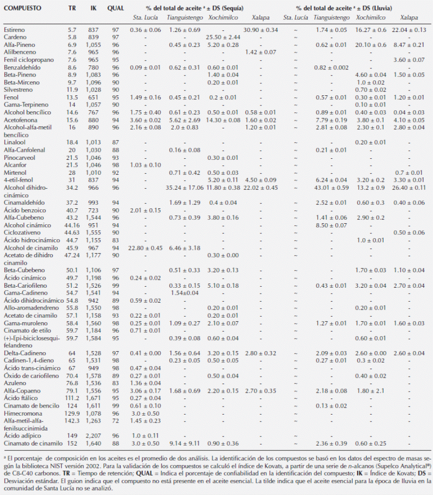 Los compuestos que mostraron mayor porcentaje en los aceites esenciales de las comunidades analizadas fueron alcohol dihidro cinámico, estireno, cardeno, alcohol de cinamilo y alfa-pineno. El alcohol dihidro cinámico se identificó en Tianguistengo, Xochimilco y Xalapa en ambas épocas de colecta. En época de lluvia se observó el mayor porcentaje en las tres comunidades y Tianguistengo presentó el porcentaje más alto en esta temporada. Santa Lucía no presentó este compuesto.