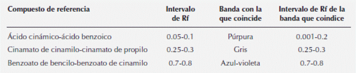 Aunque no se emplearon compuestos de referencia para el análisis de resinas, debido a que se analizó la fracción volátil por CG-EM, se encontró que algunas bandas observadas en las dos épocas de colecta concuerdan con bandas y valores de Rf de compuestos de referencia (Tabla 5) utilizados por Wagner y Bladt (2001), quienes manejaron las mismas condiciones de la fase móvil y la fase estacionaria en CCF que las usadas en el presente trabajo. Estos autores analizaron algunos tipos de exudados como el bálsamo del Perú (Myroxylon pereirae (Royle) Klotzsch), el bálsamo de Tolú (M. balsamum (L.) Harms), el benjuí de Sumatra (Styrax benzoin Dryand.) y el benjuí de Siam (S. tonkinensis (Pierre) Craib ex Hartwich). Para el análisis utilizaron como compuestos de referencia el ácido cinámico, ácido benzoico, cinamato de cinamilo, cinamato de propilo, benzoato de bencilo y benzoato de cinamilo.
