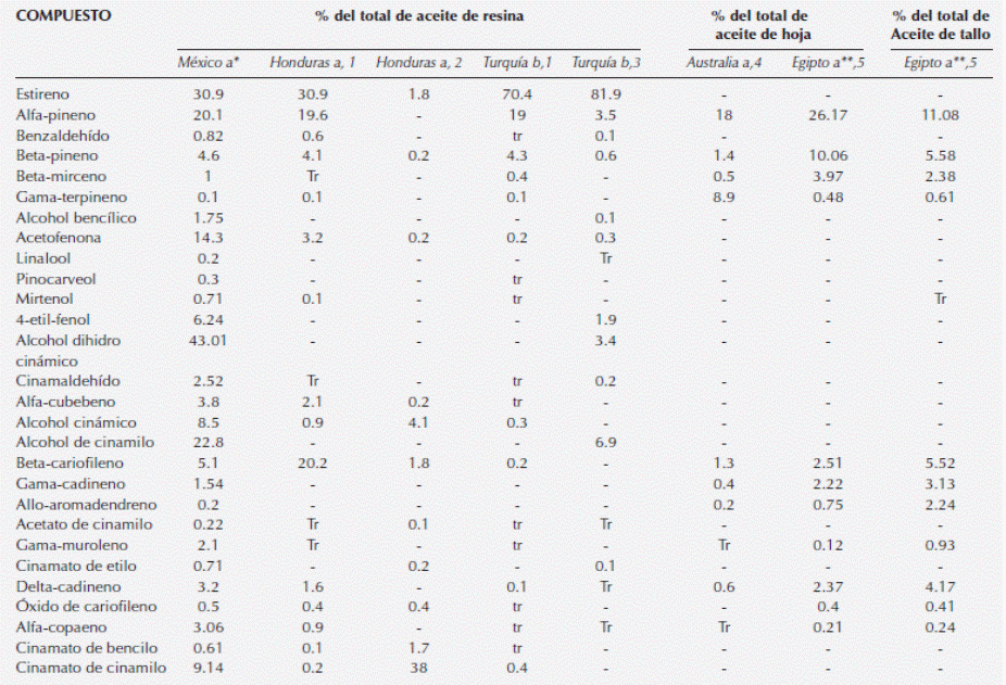Los compuestos mayoritarios observados en los aceites esenciales de Hidalgo (estireno, alfa-pineno y beta-cariofileno), también presentaron altos porcentajes en la fracción volátil de resinas de Turquía y Honduras (Fernandez et al., 2005), así que la calidad de los aceites esenciales producidos por árboles de la región de estudio debe ser competitiva con aquellos de procedencia más tradicional.