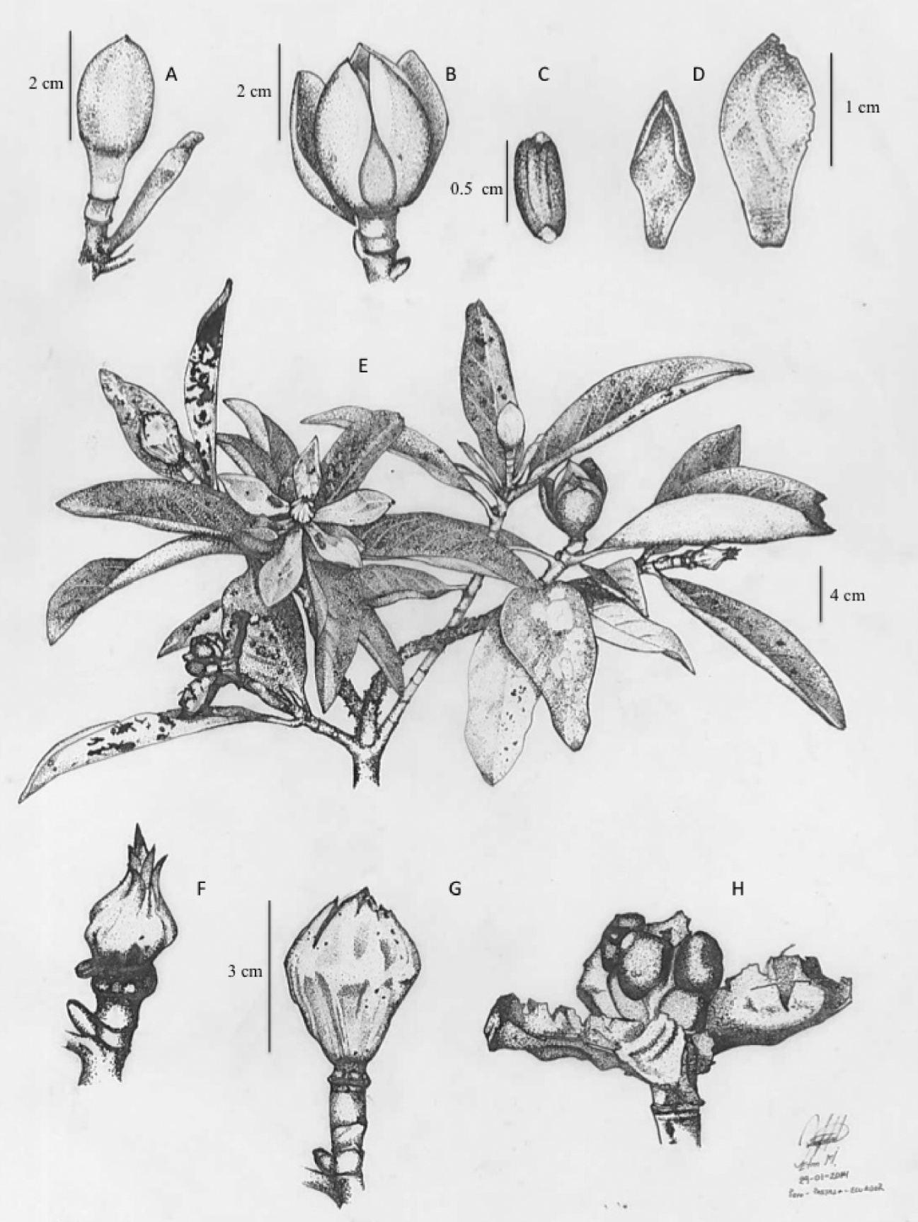 Figura 1 Magnolia llanganatensis. A) Botón Floral cubierto por hypsófilo. B) Botón Floral abriendo. C) Estambre elipsoide y diminuto. D) Pétalos interior (izquierda) y pétalo exterior (derecha). E) Rama floral con botones florales, flores y frutos. F) Gineceo. G) Fruto antes de la dehiscencia. H) Fruto en dehiscencia, con semillas.