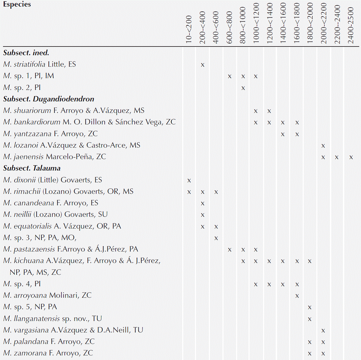 En la meta por catalogar Magnoliaceae para la Flora de Ecuador actualmente se reconocen para este país 23 especies de Magnolia, todas corresponden a la Sect. Talauma (Tabla 1), más del quintuple de las que se conocían hace cinco años (Vázquez-García et al., en prensa): cinco especies pertenecen a la Subsect. Dugandiodendron (de la Cordillera del Condor: M. bankardiorum, M. lozanoi, M. jaenensis. M. shuarorum y M. yantzazana; tres pertenecen a una Subsect. inéd.: M. striatifolia, M. sp. 1 y M. sp. 2 (del Chocó Biogeográfico, en la Costa Norte) y 15 especies propias de la Subsect. Talauma: seis de Amazonía: M. equatorialis, M. kichuana, M. neillii, M. pastazaensis M. rimachii y M. sp. 3; tres de la región del Chocó-Ecuatoriano, Costa Norte: M. canandeana, M. dixonii y M. sp. 4, una de la cordillera del Cóndor: M. arroyoana; 4; dos del sur de la Cordillera Oriental: M. palandana y M. zamorana; y tres de la porción central de la Cordillera Oriental: M. vargasiana, M. sp. 5 y M. llanganatensis, esta última aquí propuesta como especie nueva.