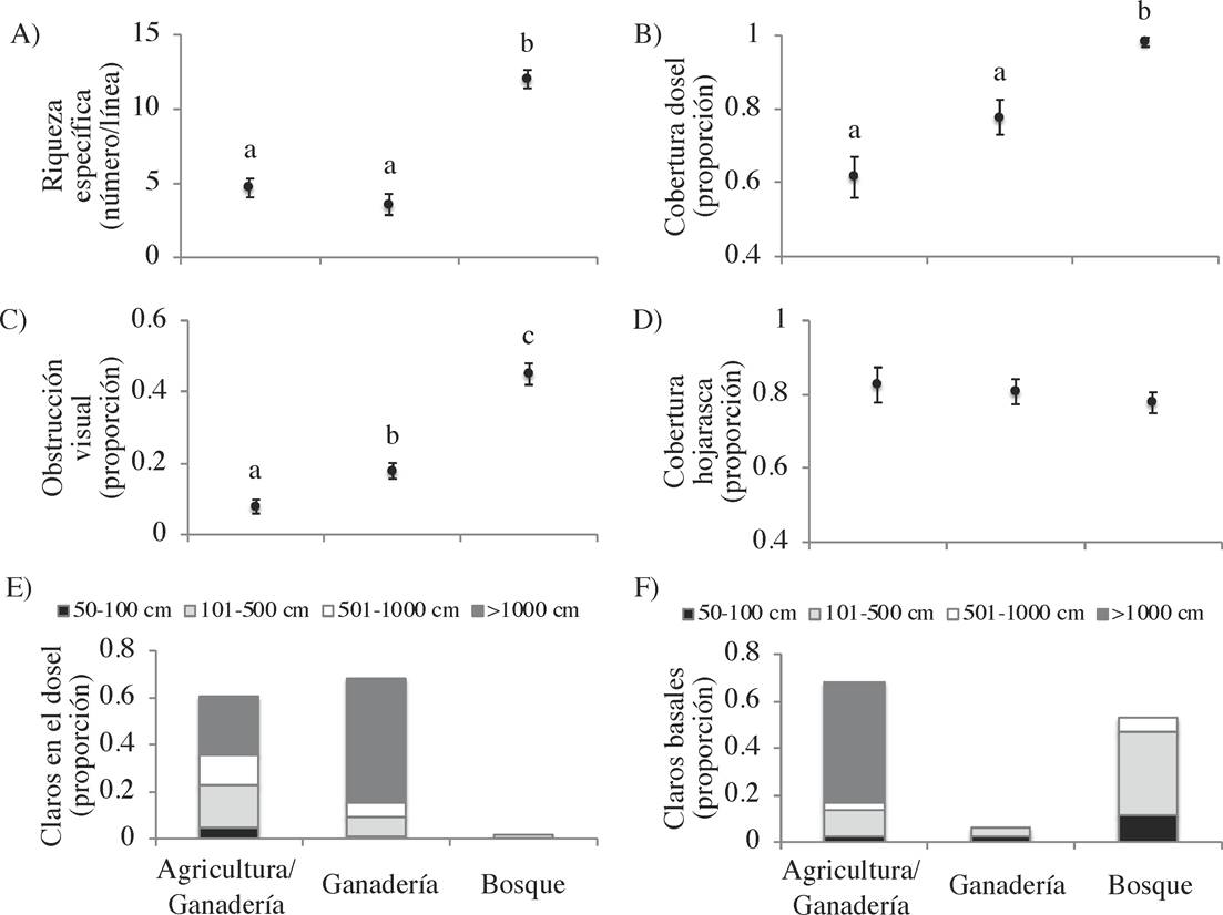 Figura 1 Media (± error estándar) de seis indicadores ecológicos en sitios con distinto manejo. A. riqueza específica de plantas. B. cobertura del dosel. C. obstrucción visual. D. cobertura de hojarasca. E. claros en el dosel. F. claros basales. Para cada indicador, las letras señalan diferencias significativas en el manejo (p < 0.05).